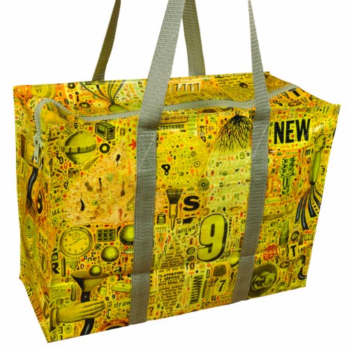 Jam packed collage eye candy by Colin Johnson. Made with 95-percent recycled woven polypropylene, a roomy exterior pocket and shoulder length straps. 15-inch w by 11-inch h by 6-1/4-inch d. The PERFECT airplane carry-on bag. Just right for shoving in the overhead compartment or stowing easily under the seat in front of you. Good for using on the ground too.